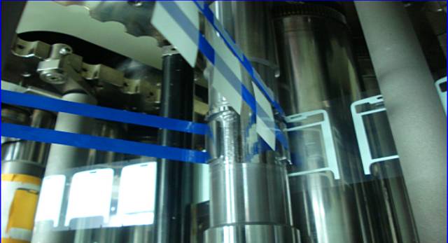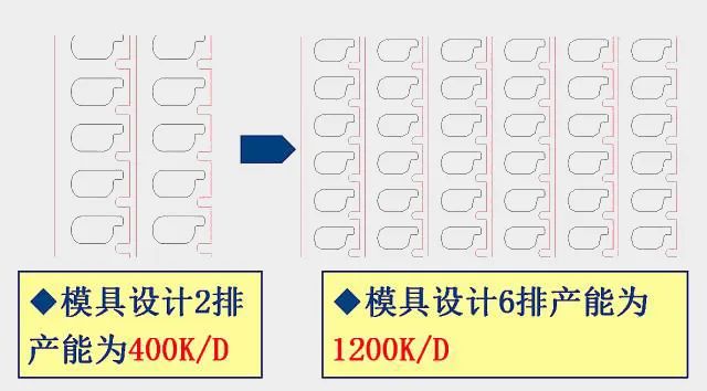 发扬圆刀成型自动去废优势,将产品废料用凸轮提取,以减少产品在包装段手工撕边料之工的浪费。 ②设计多排产品模