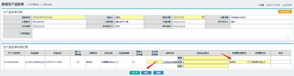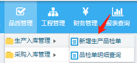 生产入库品检操作步骤: 品质管理-生产入库管理-新增生产品检单