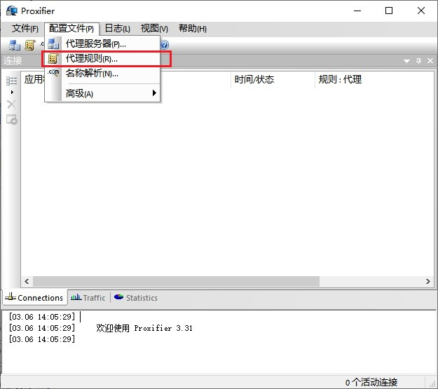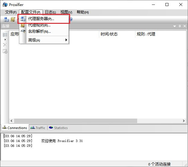 设置好后就可以开始使用了。 3.1 设置代理服务器 1) 打开Proxifier,在Proxifier的“配置文件”菜单上,单击“代理服务器”选项。