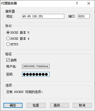 3) 在弹出的“代理服务器”对话框中,输入代理服务器的IP地址和SOCKS端口,选中“SOCKS 版本 5”单选按钮,勾选“启用”验证,输入用户名、密码(在CCProxy中已提前设置),再单击“确定”按钮。