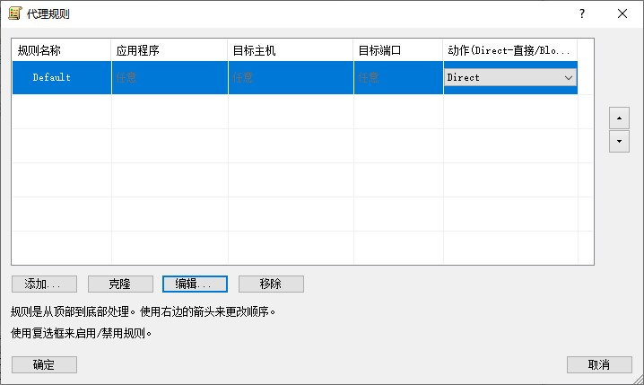 2) 在弹出的“代理规则”对话框中,先将现有所有规则都“移除”掉,只保留Default(应用程序、目标主机、目标端口全部留空,动作Direct)这一条,以免干扰运行,然后单击“添加”: