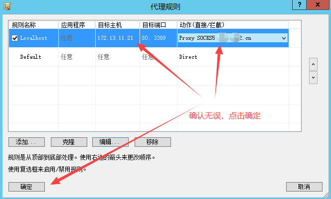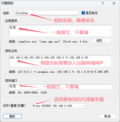 3) 新增代理规则(名称随意,下面是ClickSun),具体应用程序、目标主机、目标端口按个人需求自行设置。一般只需要设置目标主机即可(目标主机就是异地局域网内各个服务器或电脑的真实内网IP地址,多个IP时用英文分号;隔开),应用程序和目标端口一般应该留空不填,完成后点击“确定”保存。