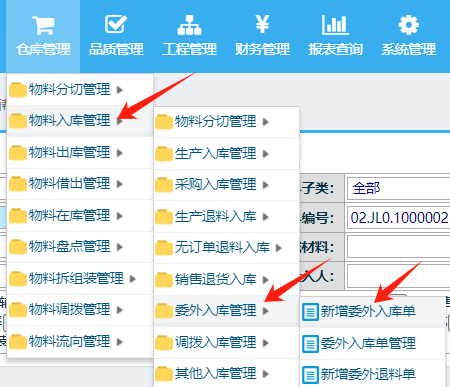 操作步骤:仓库管理-物料入库管理-委外入库管理-新增委外入库单,如下图所示: