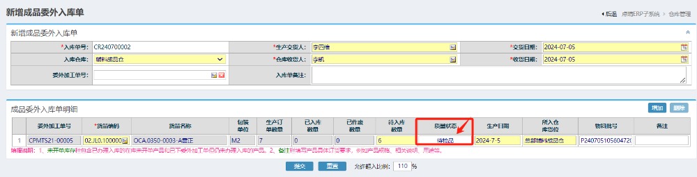 入库时,注意质量状态默认为待检品,若质量状态不为待检品,则需要通过工程去按第