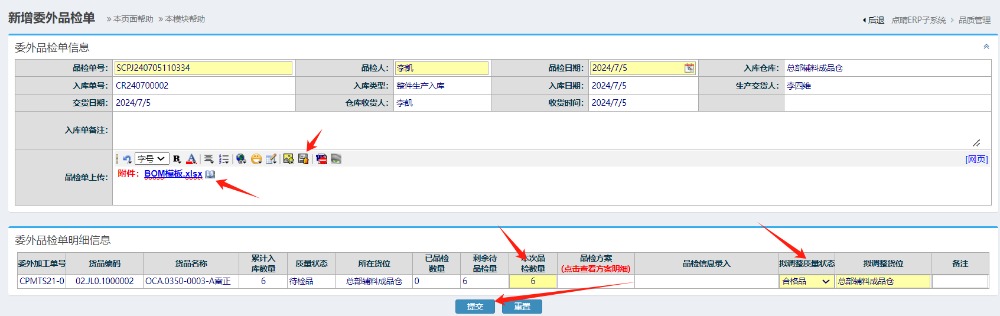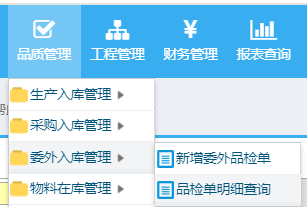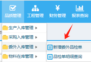 操作步骤:品质管理-委外入库管理-新增委外品检单,如下图所示: