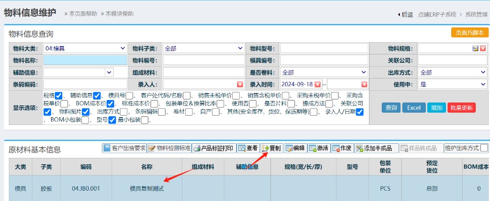点晴模切ERP物料资料复制如何操作?