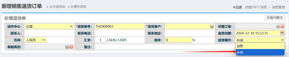 操作步骤 1、做销售退货单,操作参考对应教程:新增销售退货。 注意新增时选择“补货”选项,如下图所示: