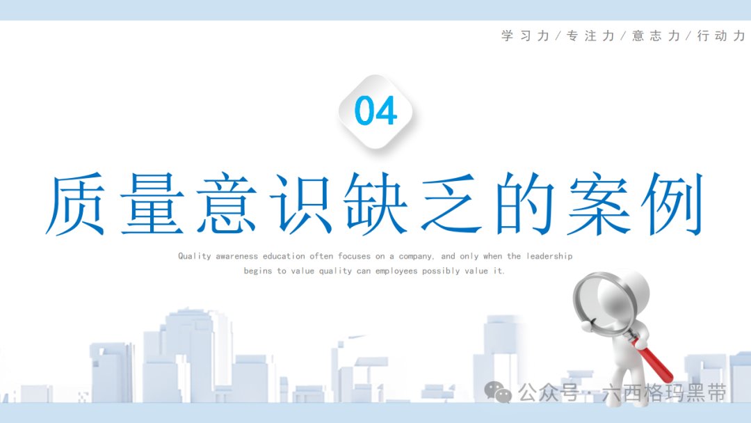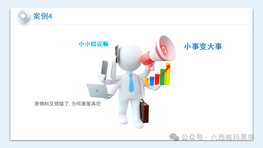 让我们来看一些质量意识缺乏的案例。案例1、案例2、案例3、案例4和案例5,这些案例都反映了我们在工作中可能遇到的一些问题。比如,小小的错误被忽视,最终导致小事变大事;原物料屡屡领错,反映出我们的管理存在漏洞;对工作要求理解不清,盲目操作,等等。这些案例给我们敲响了警钟,我们必须从中吸取教训,避免类似问题的发生。