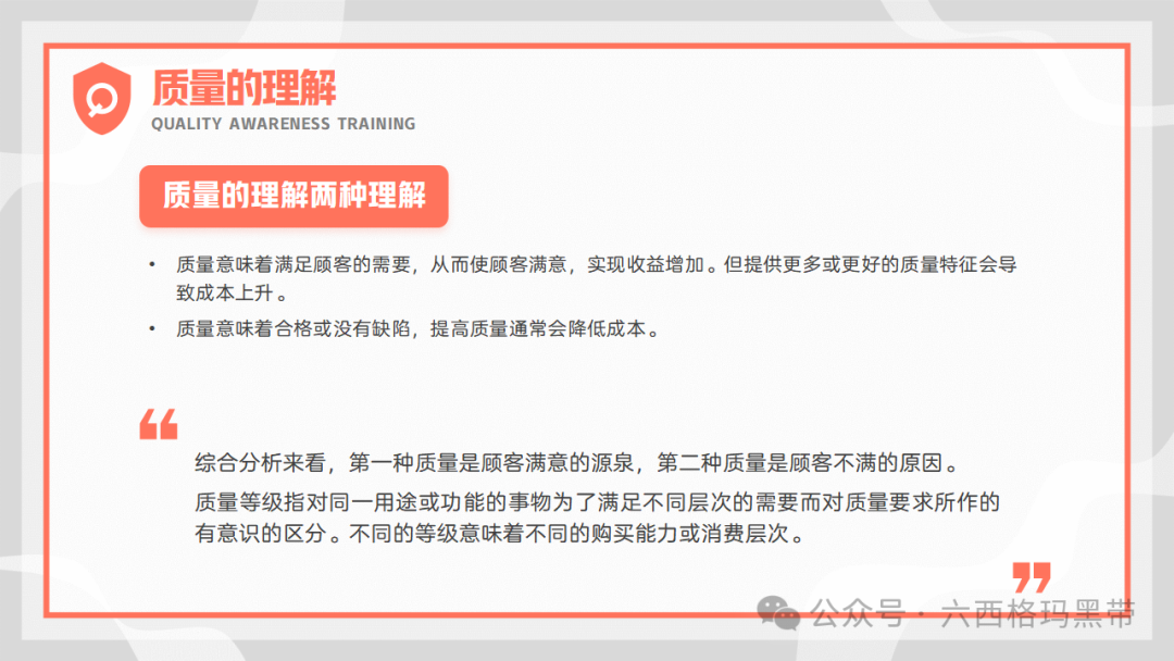 • 满足顾客需要,实现收益增加:从顾客角度出发,质量意味着产品或服务能够满足其特定的需求和期望,从而带来顾客满意度的提升,进而促进销售增长和利润增加。但这种理解可能会导致成本上升,因为为了满足更高的顾客需求,可能需要投入更多的资源和成本。