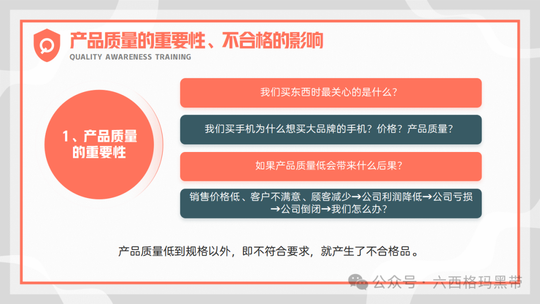 质量已成为企业持续发展和赢得客户信任的关键因素。质量意识,作为质量理念的具体体现,不仅关乎产品的优劣,更直接影响到企业的声誉、市场份额乃至生存与发展。因此,加强员工的质量意识培训,对于提升企业整体质量管理水平、促进企业文化建设具有重要意义。我们来探讨质量意识的重要性、质量的基础知识、对质量的不同理解、质量的意义以及质量的特性,旨在为员工提供全面而深入的质量管理知识,促进质量意识的提升。