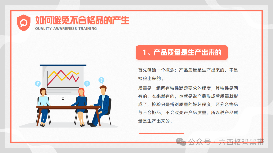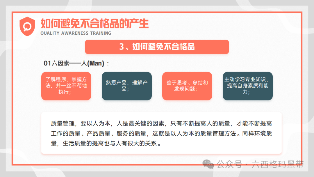 为了有效避免不合格品的产生,企业需要严格控制生产过程中的六大因素:人(操作人员)、机(设备)、料(原材料)、法(工艺方法)、环(环境)、测(测量)。通过加强对这些因素的监控和管理,可以及时发现并纠正潜在的质量问题,确保产品质量的稳定性。