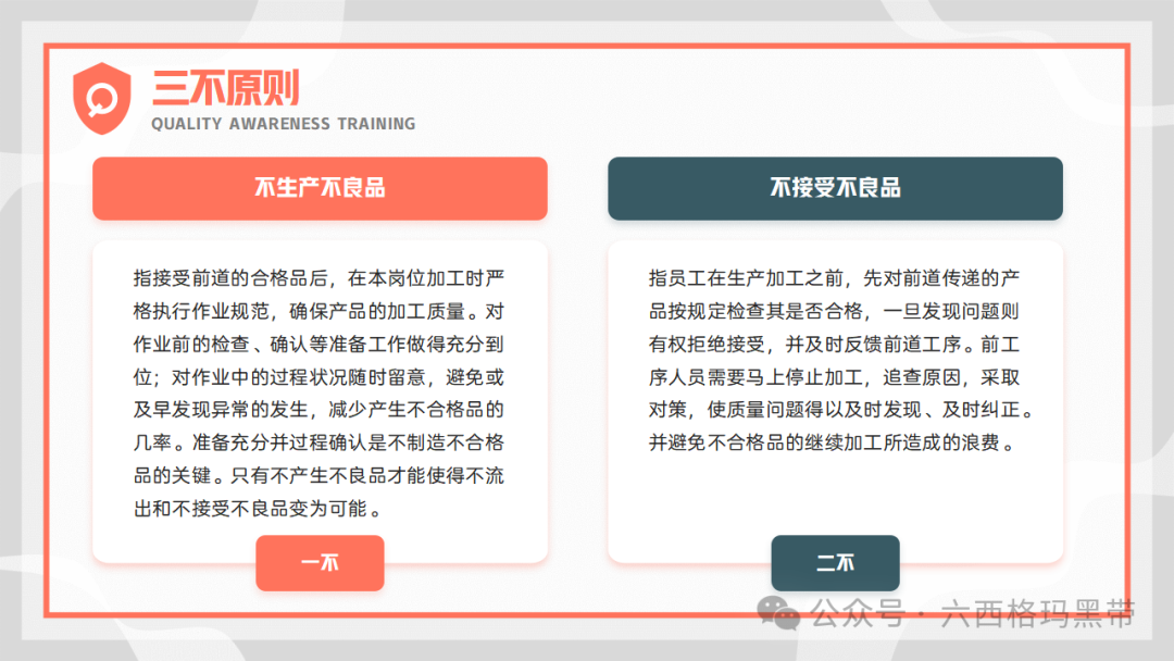 • 三不:不流出不良品。员工应确保自己生产的产品在流转至下一道工序或市场前,已经过全面的检查和验证,确保产品质量的合格性。