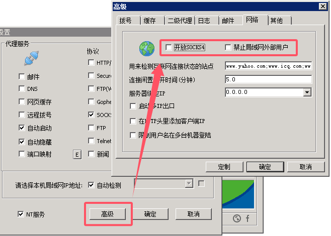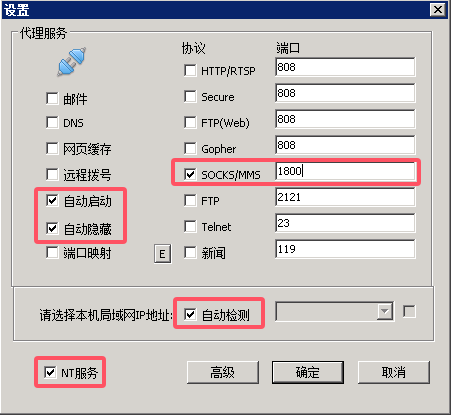 3、配置相关参数,先点击“设置”菜单图标 ![]() 为确保安全,只使用CCProxy提供的Socks5代理功能,其余协议都不要选择: 勾选以上红色框中内容,其余都不要勾选,要勾选的项目为:自动启动、自动隐藏、SOCKS/MMS、自动检测、NT服务。 然后点击“高级”按钮,找到“网络”,注意不要勾选:开放SOCKS4和禁止局域网外部用户,如下图所示,其余项目保持默认即可。 ![]() 确定勾选无误后,点击“确定”保存。 4、设置用户名与密码 为避免其他人也可以使用我们的代理服务器,务必设置用户名和密码,如图所示,点击账号。