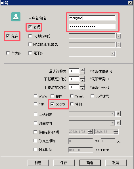 进入账号管理页面后,在允许范围内选择“允许部分”、验证类型选择“用户/密码”,再点击“新建”。 ![]() 出现如图所示的账号对话框之后,勾选“允许”、“密码”,协议只勾选“SOCKS”,其余项目都不要勾选,如下图所示,设置用户名、密码之后,点击“确定”保存。 5、点击“启动”将当前电脑设置为Socks5代理服务器开始使用