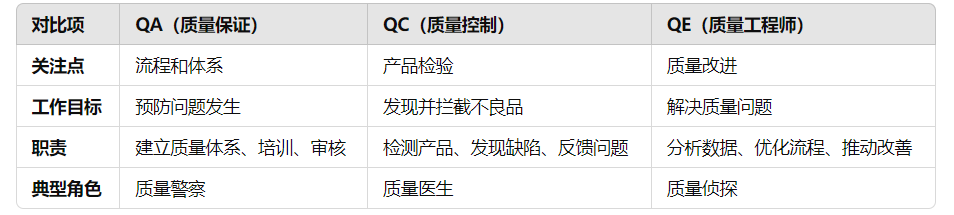 简单理解:QE 就像“质量侦探”,负责分析和解决质量问题,从根源上减少缺陷。 举个例子: 如果工厂发现有一批产品经常出现开裂,QE 就要去调查是不是原材料问题、生产工艺问题,还是设备参数有问题,并想办法解决,防止以后再出现类似情况。 3. QA、QC、QE 的核心区别 ![]() 一句话总结: