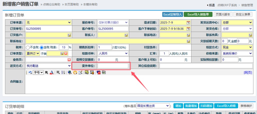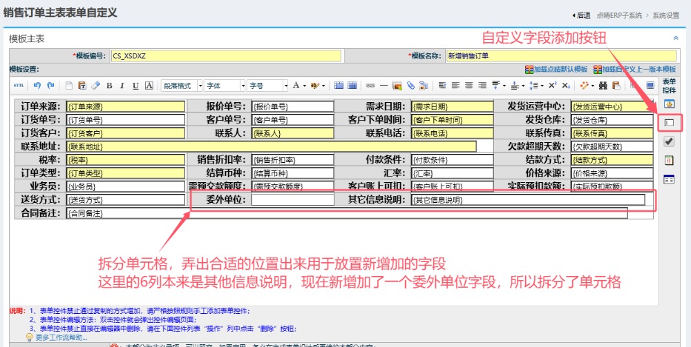 确定后,在表单中相应单元格位置就插入这个字段了,然后保存即可。 以上就可以对销售订单主表增加自定义字段了,重新进入销售订单新增页面,就会看到多了一个字段“委外单位”: