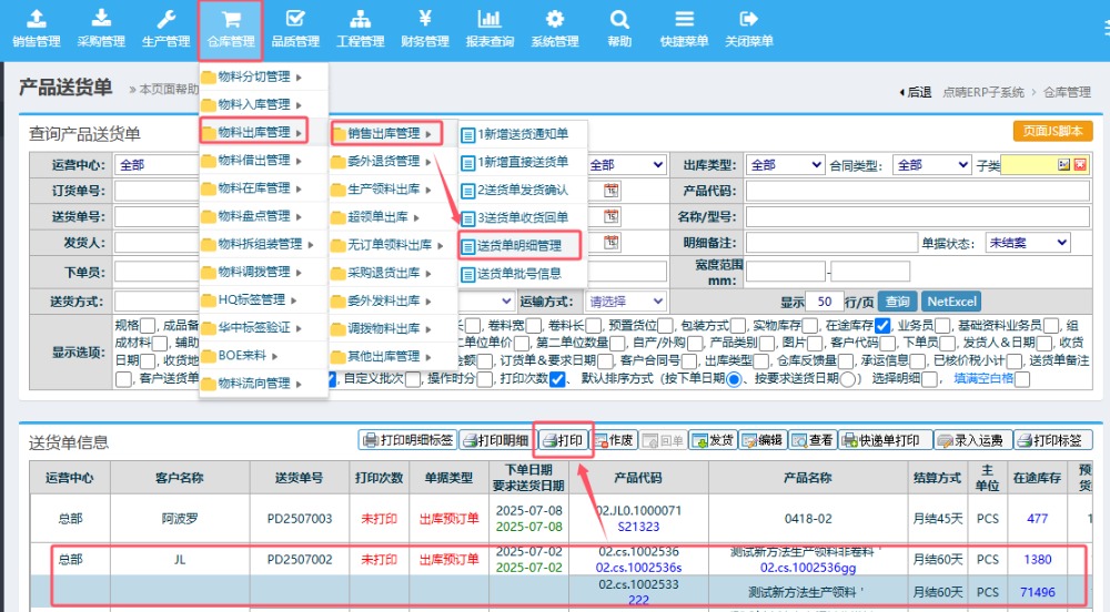 以上说明了如何对销售订单添加新的自定义字段,下面说明如何在送货单打印模板中调取并显示以上自定义字段。 还是以管理员身份登陆点晴ERP系统-》仓库管理-》物料出库管理-》销售出库管理-》送货单明细管理: