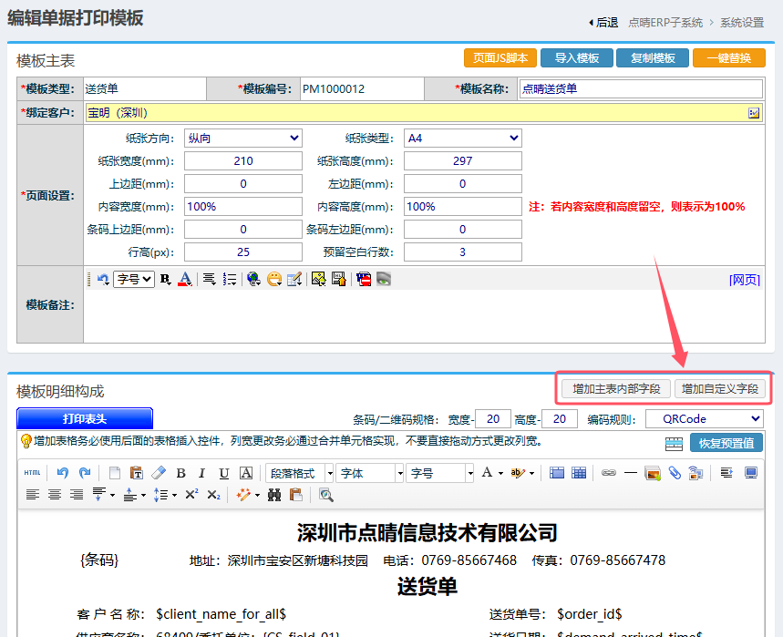 在打印模板设置页面中,提供了两个增加自定义字段的按钮:增加主表内部字段、增加自定义字段。 其中“增加主表内部字段”,是指送货单中的内部字段,不符合本次需求,所以需要点击“增加自定义字段”: