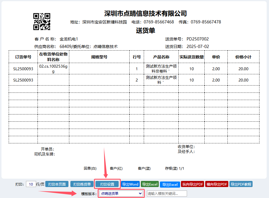 选中需要调取并显示刚刚增加字段的模板版本,然后点击“打印设置”按钮: