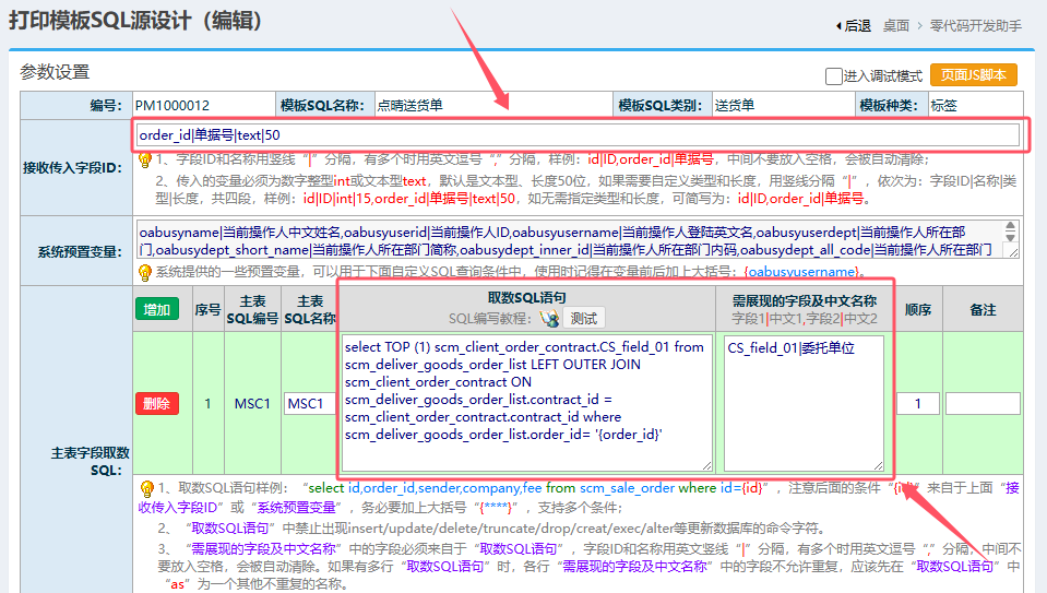 这里提供了查询此自定义字段的SQL设置,以下填入信息的具体意思和构成参见设置页面上的相应说明: 在“传入字段ID”中,输入“order_id|单据号|text|50”,这个是用于根据送货单号唯一识别出自定义字段的关键信息; 在“主表字段取数SQL”中,取数SQL语句设置为“select TOP (1) scm_client_order_contract.CS_field_01 from scm_deliver_goods_order_list LEFT OUTER JOIN scm_client_order_contract ON scm_deliver_goods_order_list.contract_id = scm_client_order_contract.contract_id where scm_deliver_goods_order_list.order_id= '{order_id}'”; 在“需展现的字段及中文名称”输入为“CS_field_01|委托单位”。 然后点击保存按钮,重新进入打印设置页面:
