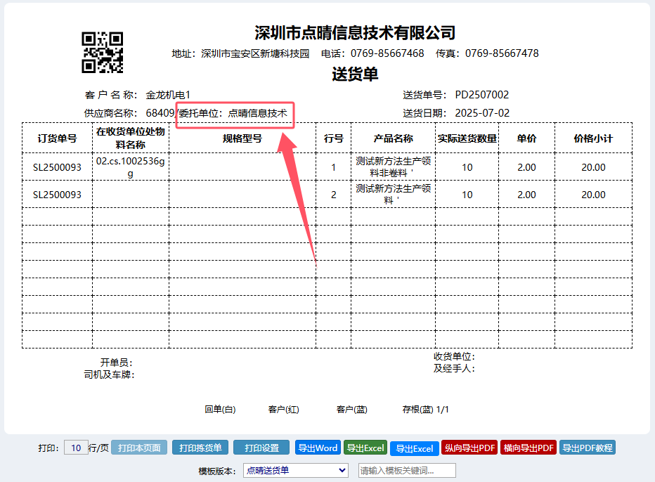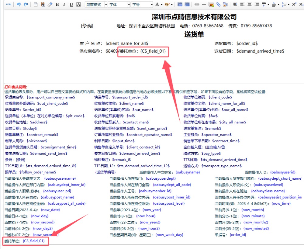 就会看到下面多了一个“委托单位:{CS_field_01}”,将其放到打印模板上适当位置,打印时,就会看到多了这个自定义字段了: