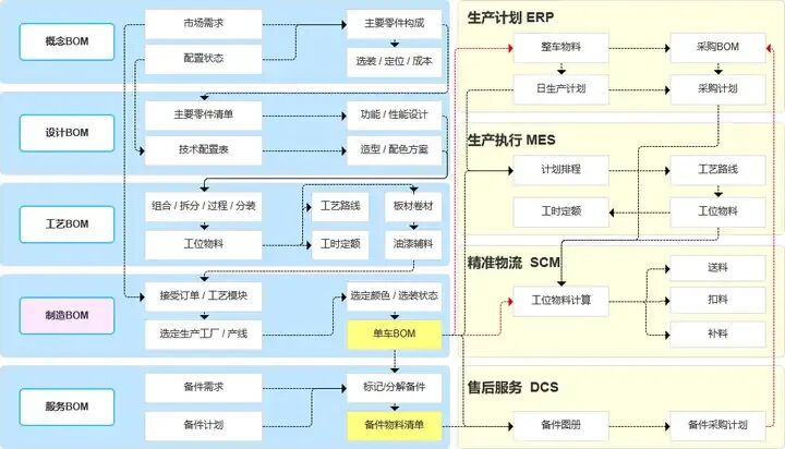 BOM分类及关联关系 1、设计物料清单(eBOM) 设计 BOM (eBOM) 是在产品设计阶段所使用的BOM,又称工程BOM。主要反映产品的设计结构和物料项的设计属性,通常基于计算机辅助设计 (CAD) 或电子设计自动化 (EDA) 工具。 设计BOM由设计部门根据产品功能需求进行编制,是后续工艺设计、生产制造等环节的依据。 设计BOM侧重于描述产品的设计结构和物料项的设计属性。 2、工艺物料清单(pBOM) 工艺BOM是在产品设计BOM的基础上,结合工艺路线对设计BOM进行了调适后得到的,它详细描述了产品制造过程中所需的物料、零部件以及它们之间的工艺关系和制造顺序。 主要用于指导生产过程中的物料准备、工艺流程安排和工位布局等。侧重于从工艺角度去分解产品的构成,并展现出产品组成的所有零部件、原材料以及它们之间的工艺关系。 通常按照工艺流程的顺序进行组织,每个工序或工位对应一组物料和相关的工艺要求。 3、制造物料清单(mBOM) 制造BOM是在工艺BOM的基础上,进一步考虑了实际生产过程中的物料需求、库存要求和生产数量等因素后得到的。详细列出了所有生产所需的零部件、原材料和组件,以及它们之间的关系和数量。 主要用于指导生产计划的制定、物料的采购和库存管理等,确保了产品能够按照规格要求生产,并提供了物料需求计划的基础数据。 通常按照产品的结构层次进行组织,从顶层总装配件开始,逐级展开到更小的子装配件和零部件。 制造BOM是制造公司最常见的BOM类型,为生产计划、物料采购、库存管理、成本控制等环节提供关键数据支持。 4、服务物料清单(sBOM) 服务BOM是描述产品在售后服务阶段所需的物料、零部件、服务步骤以及相关信息的一种清单。 通常用于支持产品的维修、保养、更换零部件等售后服务活动,确保服务人员能够准确、快速地获取所需物料和服务步骤信息,提高服务质量和效率。 5、单级BOM 单级 BOM 通常用于结构不复杂且不包含子组件的产品。通常,此文档包含产品构造中使用的所有零件的总数,这些零件按零件编号顺序列出。此类文档的结构仅允许在组件、组件和材料中存在一级子级。 6、多级BOM 与单级 BOM 相比,多级 BOM 往往用于更复杂的构造,因此包括子组件,通常分解为进一步的子组件层级。在本文档中,每个项目编号(原材料或人工)都必须与父项目相关联,但最顶层除外。 样例展示方桌BOM就是多级BOM,需要先制造【半成品桌面】、【半成品桌腿】,然后开始统一转配,生产方桌。 三、BOM的重要性在生产计划环节:BOM为生产计划提供数据支持 通过BOM数据,企业可以清晰地了解生产每个产品所需的所有物料,含原材料、零部件、辅料等。详细的物料清单不仅确保了生产计划的准确性,还避免了因物料短缺或过剩导致的生产延误和成本浪费。 BOM还可以根据生产需求的变化,及时调整生产计划,确保生产流程的顺畅进行。 在原材料采购环节:为采购部门提供明确的采购清单 BOM可以详细列出生产所需的各种原材料和零部件、及其比例关系,为采购部门生成明确的采购清单,准确地计算出所需原材料的数量和规格,从而进行有针对性的采购。 BOM还可以与供应商管理系统集成,实现原材料采购的自动化和智能化,提高采购效率和降低采购成本。 在生产用料方面:通过BOM表单估算范围,来进行资源的合理配置 通过BOM表单,可以捕捉所有有用数据,进行成本估算,能够根据BOM表单估算范围,来进行资源的合理配置。 从而有效减少浪费,降低成本。 BOM 还可以将复杂的生产流程拆分到每个组件,从而能够使得生产更加有条理,从每个组件、配料就开始进行质量控制。 在库存管理方面:帮助企业制定合理的库存水平 通过精确的物料需求计划(MRP),BOM可预测出未来一段时间内企业所需的物料数量,从而帮助企业制定合理的库存水平。 这有助于企业降低库存成本,减少资金占用,同时确保物料供应的及时性和稳定性。 BOM还可以辅助监控库存状态,预警库存短缺或过剩的情况,帮助企业及时采取应对措施。 在产品生命周期管理方面:支持产品从设计到报废的整个生命周期管理 在产品设计阶段:BOM管理系统可以帮助企业制定详细的产品物料清单和成本估算; 在生产阶段:BOM管理系统可以确保生产过程的顺利进行和物料供应的及时性; 在售后服务阶段:BOM管理系统可以帮助企业跟踪产品变更和维修记录等信息。这有助于企业实现产品信息的全面掌控和持续优化产品的设计、生产和服务流程。 常见问题解答【物料清单】问:BOM 代表什么? 答:BOM 代表物料清单,是对生产和供应链管理至关重要的结构化文档。 问:什么是 BOM 工具? 答:BOM 工具是一种软件,旨在高效地创建、组织和管理物料清单,从而帮助产品开发和制造流程。 问:BOM 的示例是什么? 答:BOM 的一个示例是详细列出组装特定产品(例如智能手机)所需的螺钉、螺栓和电子零件等组件的列表。 问:BOM管理策略是什么? 答:管理策略是指对物料清单的创建、维护、更新和使用的全过程管理,旨在确保BOM数据的准确性、完整性和及时性,以支持企业的产品开发、生产制造、成本控制、供应链管理等各项业务活动。 问:如何提高 BOM 准确性? 答:为了提高 BOM 准确性,请确保定期更新,协同跨部门团队,使用可靠BOM软件,并保持严格的版本控制。 BOM是物料清单,定义了产品和半成品(部件)、原材料之间的关系,为
