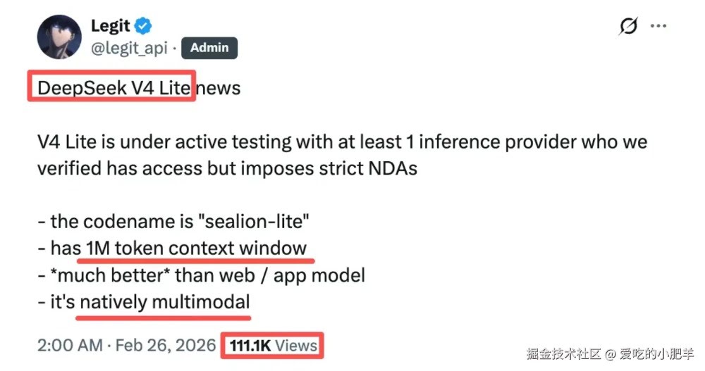 昨天晚上,我刷 X 的时候,看到一条推文。 一个叫 Legit 的开发者,发了一段关于 DeepSeek V4 的爆料,几个小时之内,12 万阅读,转发量一直在涨。我点进去,看完以后,信息非常真!