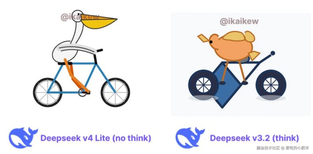 网友 Fandu 泄露的,DeepSeek V4 Lite 和 V3.2 的对比,第一组是"骑自行车的鹈鹕"。