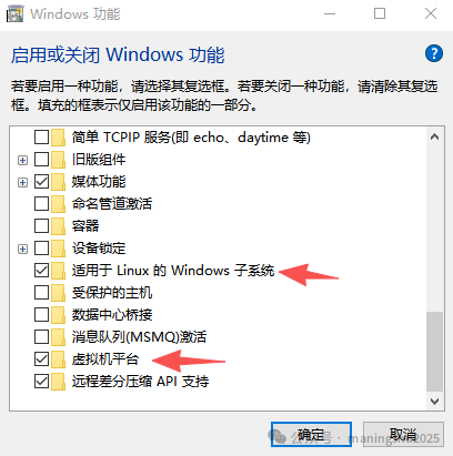 三、手动安装步骤 可以使用wsl --install一行命令安装,如果遇到问题,可以使用下方的手动安装步骤。 3.1 win+s,输入启用Windows功能,勾选下方2个功能