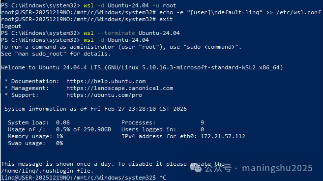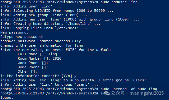 至此,你已经成功在Windows上安装并配置好了WSL。 四、创建新用户