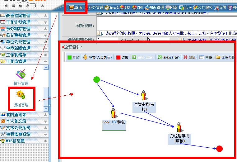 点晴OA的工作流支持直接手工绘制流程图,然后系统立即会转换成标准的处理流程,用户完全无需掌握任何编程知识: