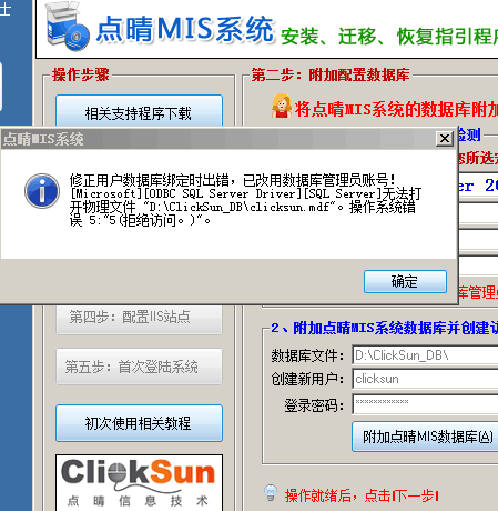 采用点晴MIS半自动安装程序时附加数据库失败,提示:无法打开物理文件,操作系统错误拒绝访问,如何解决?