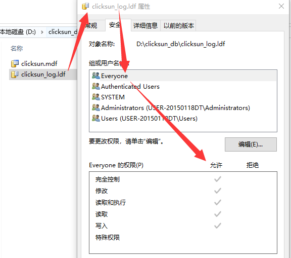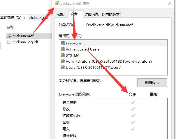 正常情况下,应该就可以附加数据库成功了。 如果还是提示这个,那就给目录中的两个文件clicksun.mdf、clicksun_log.ldf也分别赋予everyone全部访问权限: