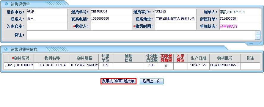 操作步骤:销售管理——销售退货单管理——退货单明细管理;进入页面如下图操作: 点击“反审退货单”即可 销售退货单作废操作:销售管理——销售退货单管理——退货单明细管理;进入页面如下图操作: 点击作废进入作废确认页面: 点击“作废指定产品及数量”即可。