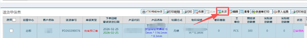 进入页面后操作步骤:选择客户名称——点击查询——选中对应送货单——点击“发货”。