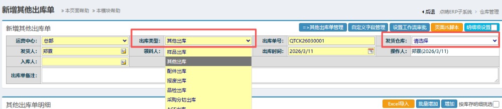 点晴模切ERP仓库管理—仓库出库管理之新增其他出库单
