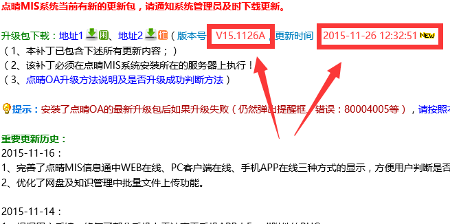 http://update.oa22.cn 由于点晴OA系统的安装程序制作比较麻烦、而升级包的制作则十分简单方便,正常情况下,一般点晴OA安装程序一年只更新1~2次,所以用户安装的点晴OA正常情况下并不是最新版本。管理员安装点晴OA系统完毕后,应该立即在OA服务器上下载以下最新版升级包,将点晴OA服务器升级到最新版本。