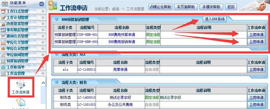 ![]() 在工作流中也可以直接开始使用预算报销管理模块的预算申请和报销申请: