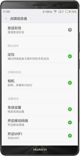 5.1、打开设置——点击权限管理 5.2、进入页面后点击“自动启动管理”5.3、进入页面,选择“点晴信息通”,设置启动,如下图: