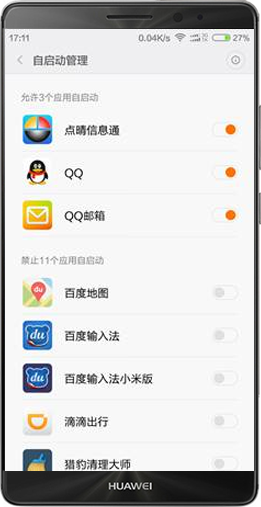 点击“设置 > 权限管理 > 自动启动管理(开机自动启动)”,将点晴信息通设置成允许开机自动启动。