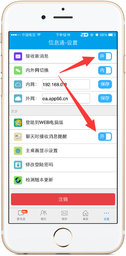 3.1.开启点晴信息通应用内部的通知功能,“设置 -> 开启新消息提醒”;
