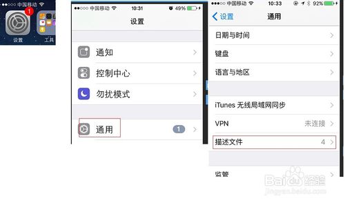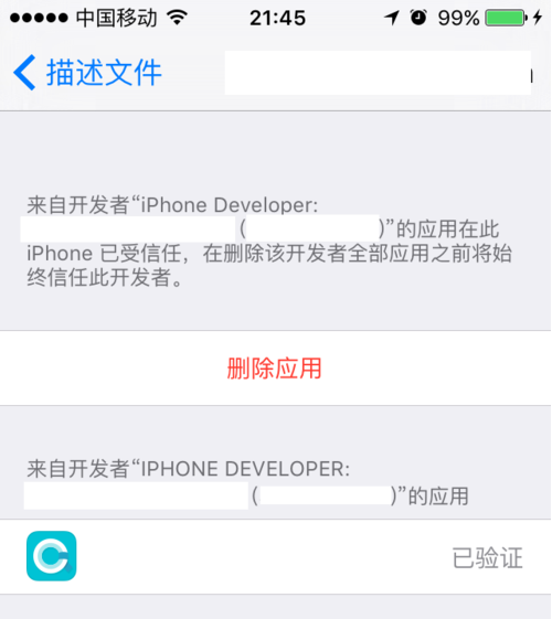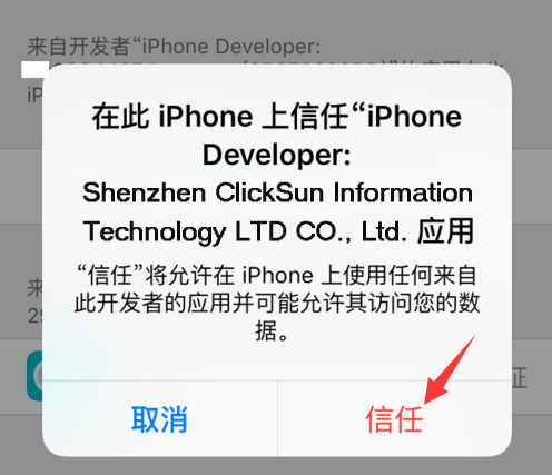方法/步骤 、安装完以后,会弹出这个框框,只要记住这个描述文件的名字就好了(这个描述文件的前几个字母要记住,方便后面找到然后信任他),然后点取消无视它:![]() 、打开设置-通用-描述文件:![]() IOS11以上版本不叫描述文件,叫设备管理: ![]() 、找到之前提示的开头的描述文件,点击进去:![]() ![]() 、继续点击那个(蓝颜色的文字)的东东,然在弹出的信任里面点击“信任”就好了:![]() 、信任完以后,发现中间那一栏“信息(【我的苹果账号或者其他的开发商】)”,变成了“删除应用”,表示已经信任配置成功了。现在就可以按Home键返回桌面,打开“点晴信息通”应用,进行测试和使用了。![]() 、打开点晴信息通,开始使用。该文章在 2021/1/13 16:49:32 编辑过 |
