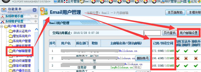 ![]() 网管可以在以下位置查看所有员工Email空间占用情况: