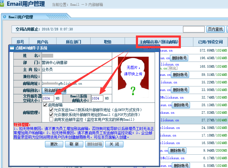 点击邮箱名称,可以直接设置每隔员工允许使用的网盘和Email空间大小: