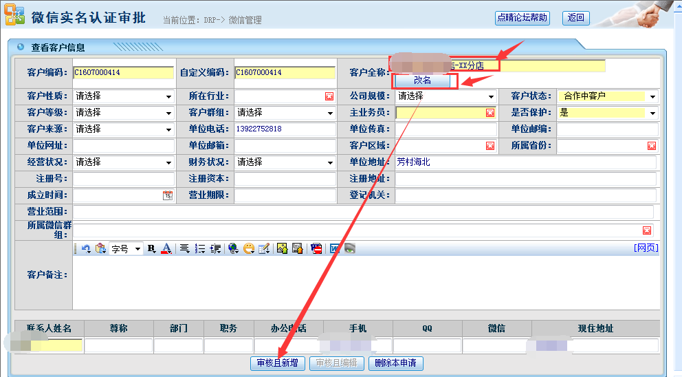 审核时,若判断客户名字与历史客户名称一样,可先给客户加上后缀名,再点击改名,之后完善信息,点击“审核并新增”按钮即可;如下图所示: