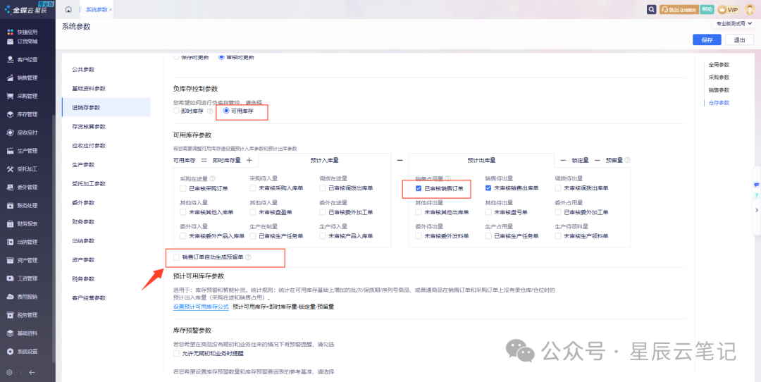 功能介绍新增库存单据,支持自动预留和手动预留2种形式,可实现销售订单库存自动占用及扣减。应用场景可适用于业务员开单后,系统自动预留库存,避免被其他人开单占用,导致销售出库时库存不够的问题。适用版本金蝶云·星辰3.1所有版本(标准版/专业版/旗舰版)功能说明1、系统参数优化1)系统参数>进销存参数>仓存参数>负库存控制参...