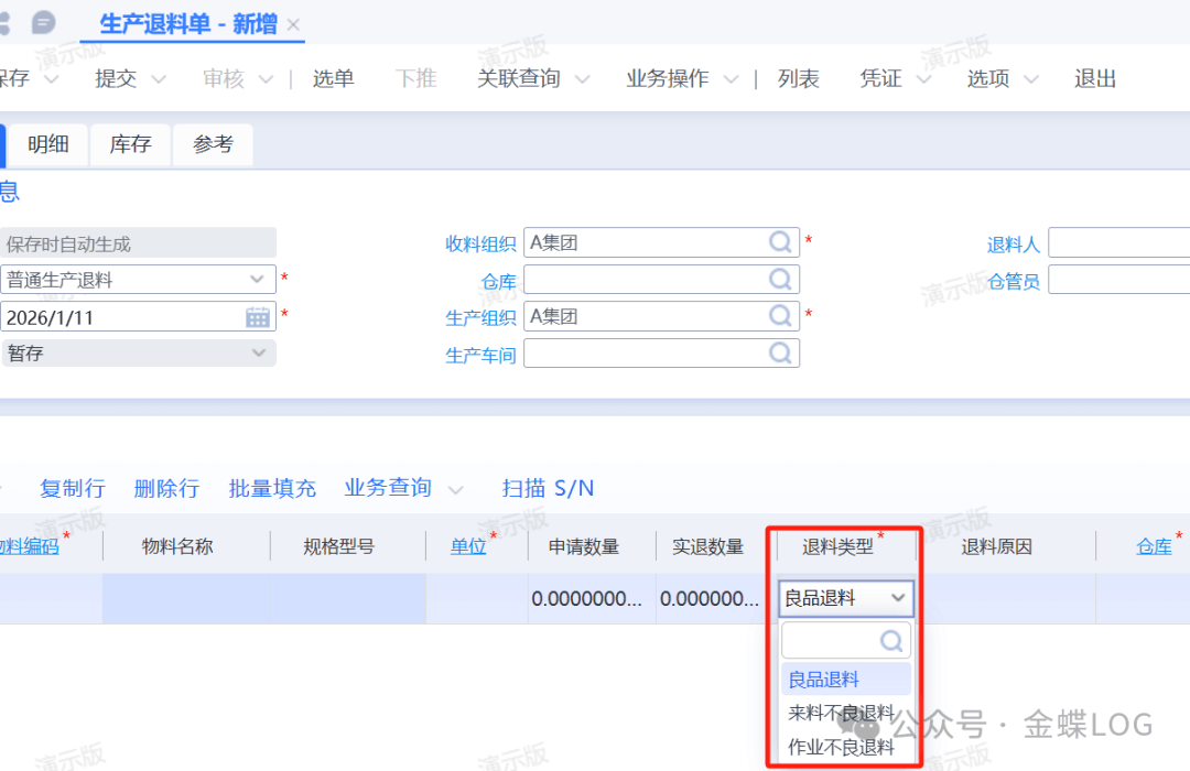 问题描述平时在进行生产退料的时候,单据上有个退料类型字段:“良品退料”、“来料不良退料”和“作业不良退料”,它们分别表示什么意思?学完本篇文章,您将学会:①生产退料单【退料类型】的作用。②不同退料类型对生产用料清单的影响③如何默认【来料不良】和【作业不良】库存状态