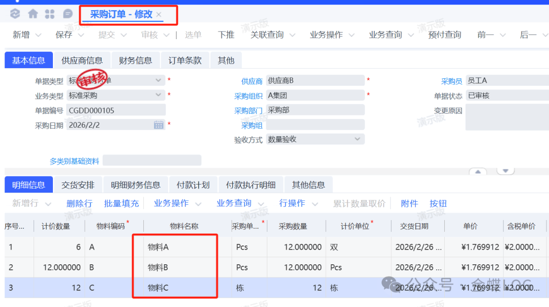 Q问题描述采购订单有三行物料,可以作废或删除其中一行吗?学完本篇文章,您将学会:①订单作废按钮的生效范围②已审核没有下游的删除方式③已审核且有下游的删除方式