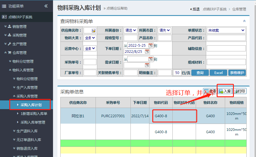进入仓库管理--》采购入库管理--》采购入库计划,选择需要入库的采购订单 确认本次入库数量,确认并保存