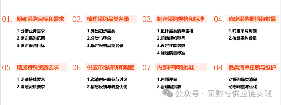采购品类清单是采购活动中最重要的输入项之一,品类清单在集中采购过程中扮演着至关重要的角色。它不仅是采购活动的基础,也是确保采购过程高效、准确和有序进行的关键工具。一、采购品类清单的定义。采购品类清单通常是一份详细的文档或列表,用于记录企业在采购活动中所需的各种物品或服务的分类和具体项目。它是一份系统化的文件,其中包含了...